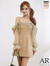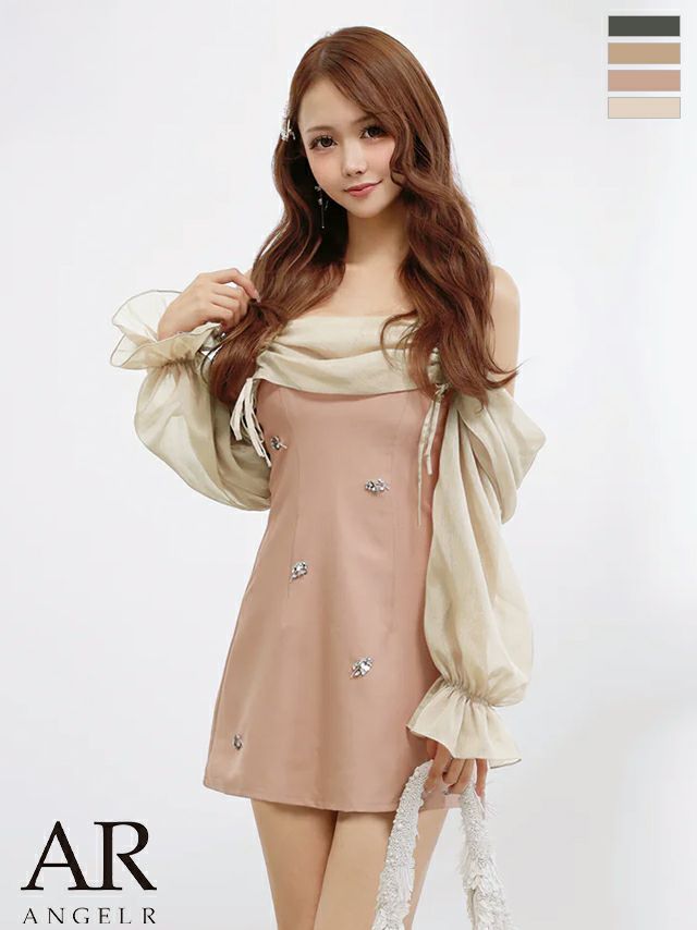 程よいフレアで美シルエットをメイク♡ [Angel-R/エンジェルアール] 高級 ブランド ワンピース Aラインミニドレス 長袖 オフショルダー 肩出し 2way リボン フラワーモチーフ ビジュー