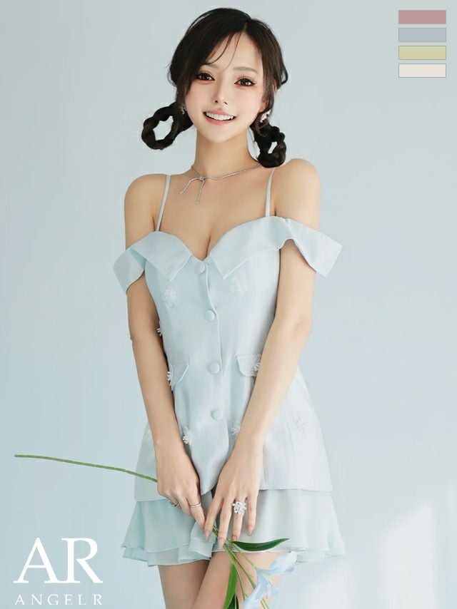 4. [Angel-R/エンジェルアール] 高級 ブランド Aラインミニドレス 谷間 肩出し フラワーモチーフ フロントボタン 裾シフォン