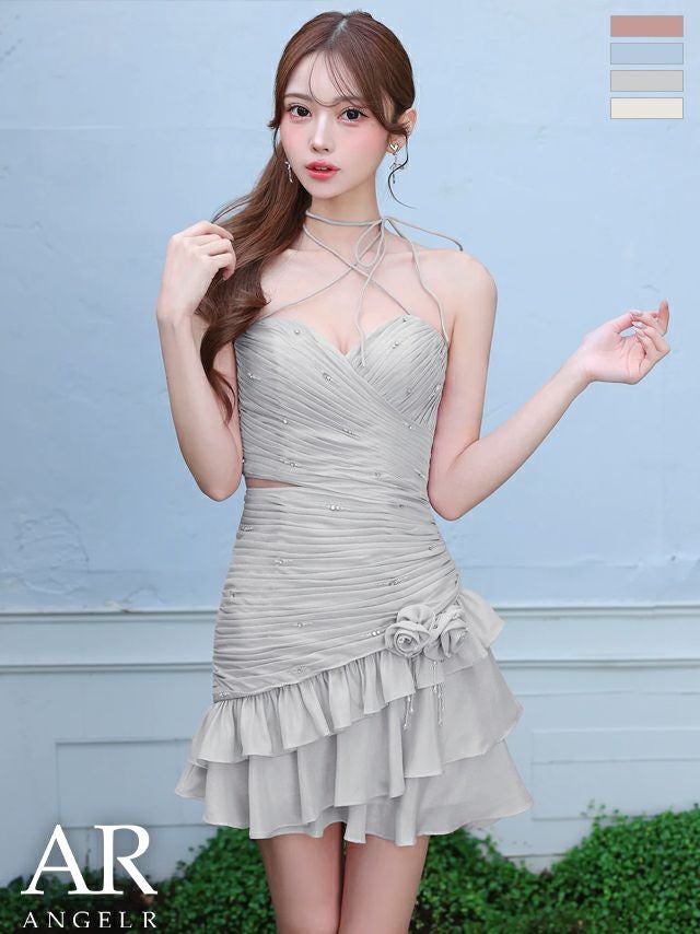 ギャザーで美ボディを演出♡ [Angel-R/エンジェルアール] 高級 ブランド フレアミニドレス 谷間 クロスホルターネック ハートカット ビジュー ウエストカット 裾フリル ローズモチーフ