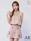 艶めくサテンで大人っぽさをプラス♡ [Angel-R/エンジェルアール] 高級 ブランド Aラインミニドレス ホルターネック サテン 立体フラワーモチーフ 胸元カバー ワンカラー