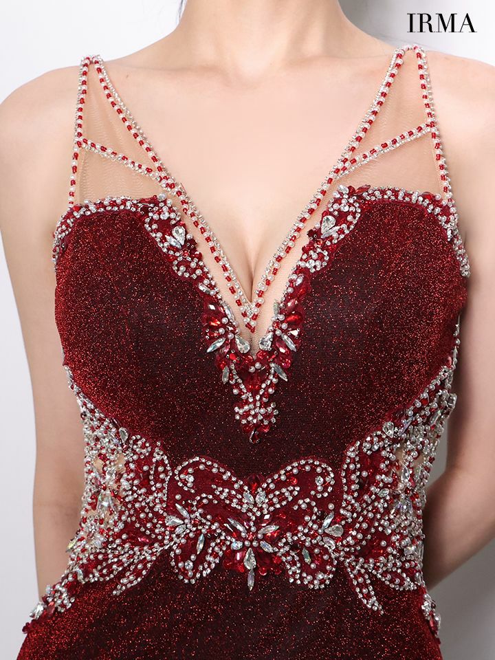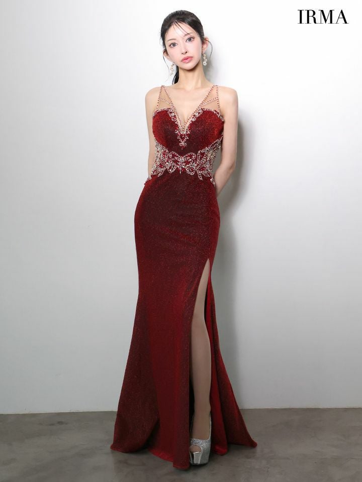 ラグジュアリーなオーラ溢れる♡ 予約商品【4月下旬入荷予定】[IRMA/イルマ] 高級 ブランド タイトロングドレス 谷間 ノースリーブ ビジュー ラメニット スリット バックスピンドル