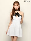 可愛さと色気を醸し出す1着♡ [IRMA/イルマ] 高級 ブランド Aラインミニドレス 谷間 ホルターネック 背中魅せ ブラックレース ビジュー リボンブローチ付き