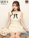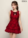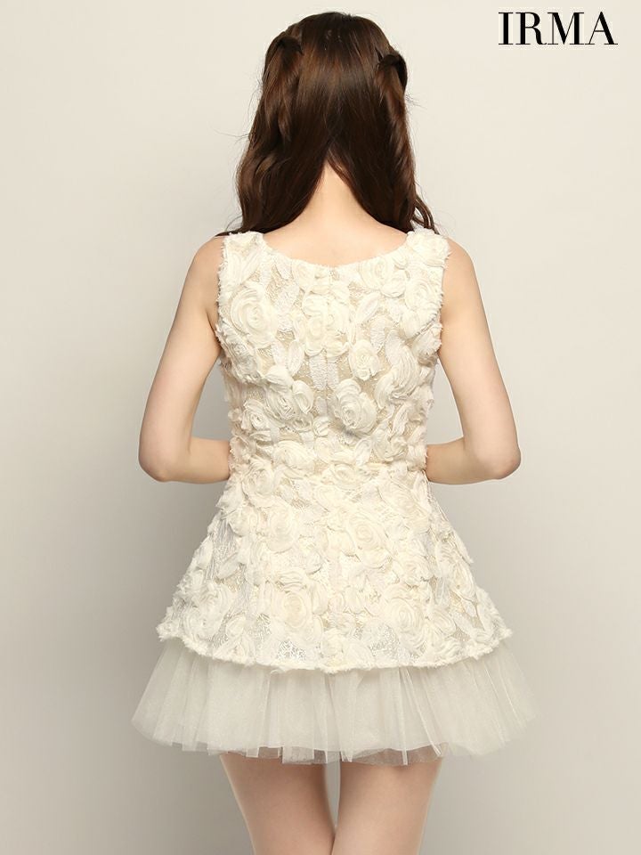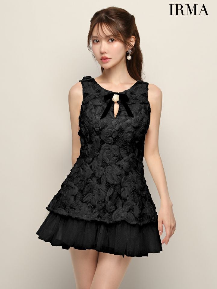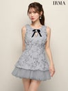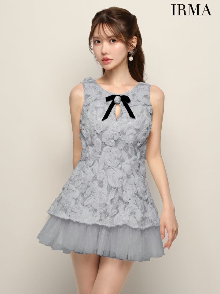 身に纏うだけでフェミニンな女性に♡ [IRMA/イルマ] 高級 ブランド Aラインミニドレス ノースリーブ 3Dフラワーレース チュール切替 リボンブローチ付き