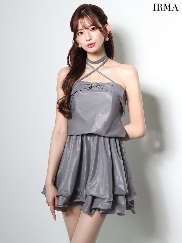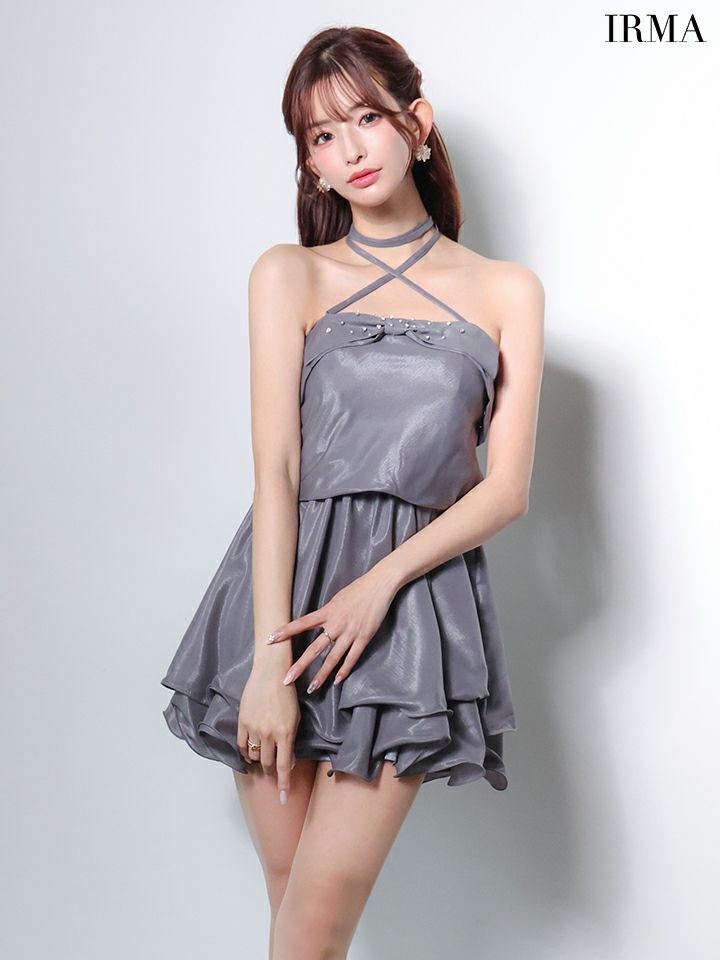 艶感が大人っぽさを引き立てる♡ [IRMA/イルマ] 高級 ブランド Aラインミニドレス 背中魅せ ホルターネック 2way バストリボン ビジュー フリル