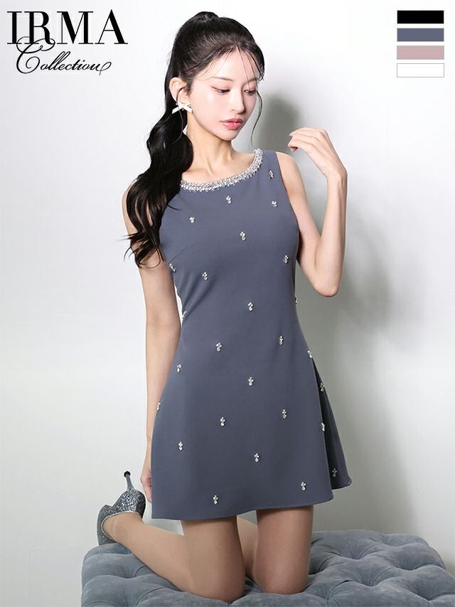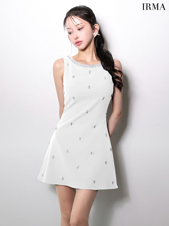 程よい肌見せで上品に♡ [IRMA/イルマ] 高級 ブランド ワンピース Aラインミニドレス ノースリーブ ビジュー ワンカラー