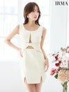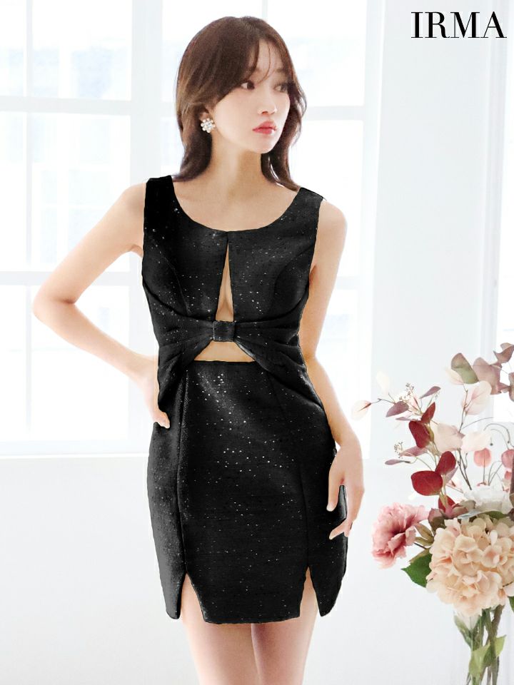 セクシーボディをメイク♡ [IRMA/イルマ] 高級 ラウンドネック ノースリーブ バストシースルー ウエストカット スパンコール ツイード スリット タイトミニドレス