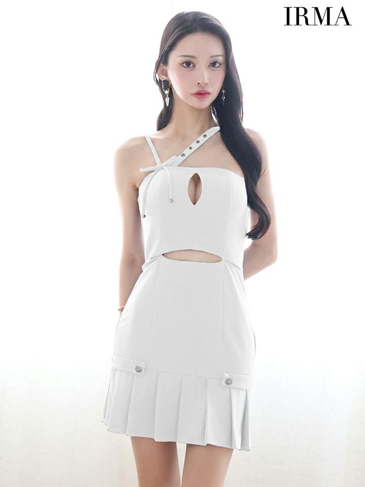 3. [IRMA/イルマ] 高級 ワンショルダー ウエストカット リボン ボタン バストカット プリーツ タイトミニドレス