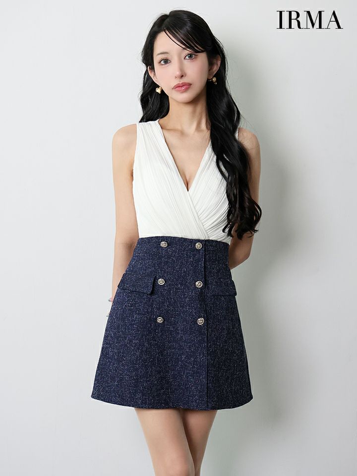美しいバストラインをメイク♡ [IRMA/イルマ] 高級 ブランド Aラインミニドレス 谷間 ノースリーブ シフォン カシュクール ツイード切替 ダブルボタン