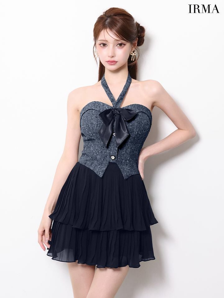 5. [IRMA/イルマ] 高級 ブランド Aラインミニドレス 谷間 セットアップ 2way ホルターネック ベア リボン ツイード シフォン