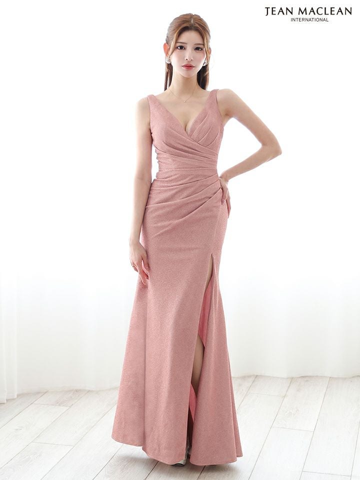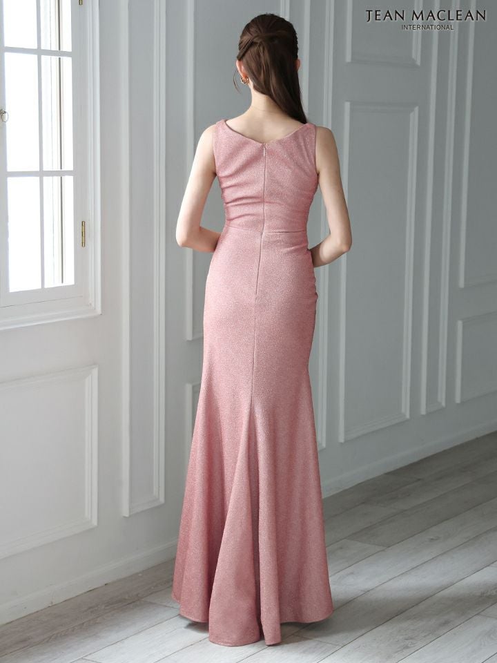 4. [JEANMACLEAN/ジャンマクレーン] 高級 ノースリーブ ワンカラー ラメニット 谷間魅せ タックデザイン スリット シンプル タイトロングドレス