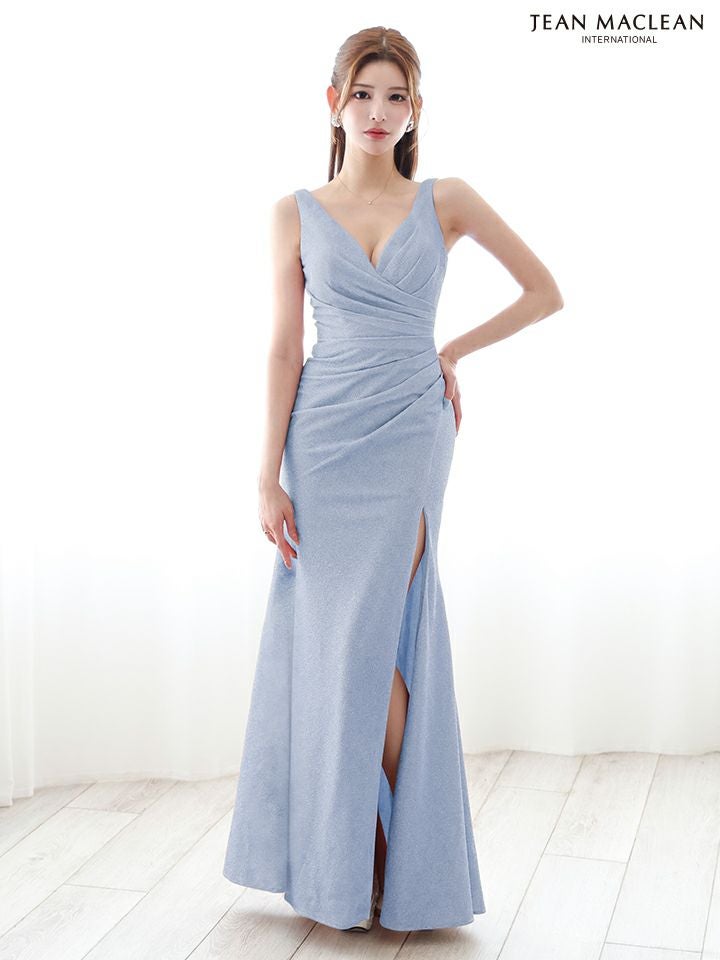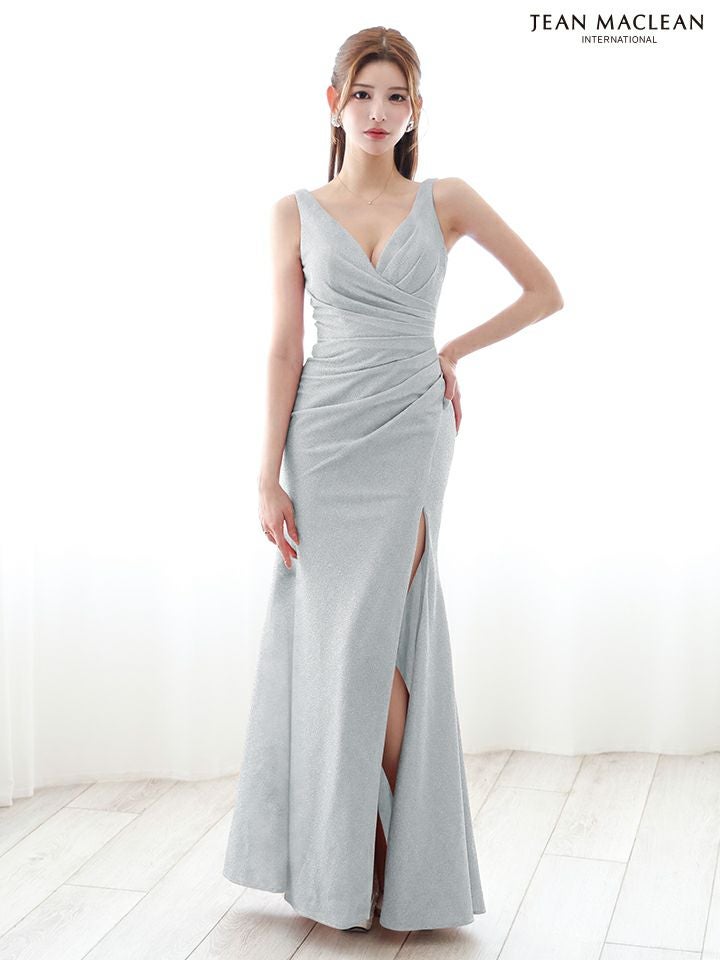 エレガントな美ボディをメイク♡ [JEANMACLEAN/ジャンマクレーン] 高級 ノースリーブ ワンカラー ラメニット 谷間魅せ タックデザイン スリット シンプル タイトロングドレス