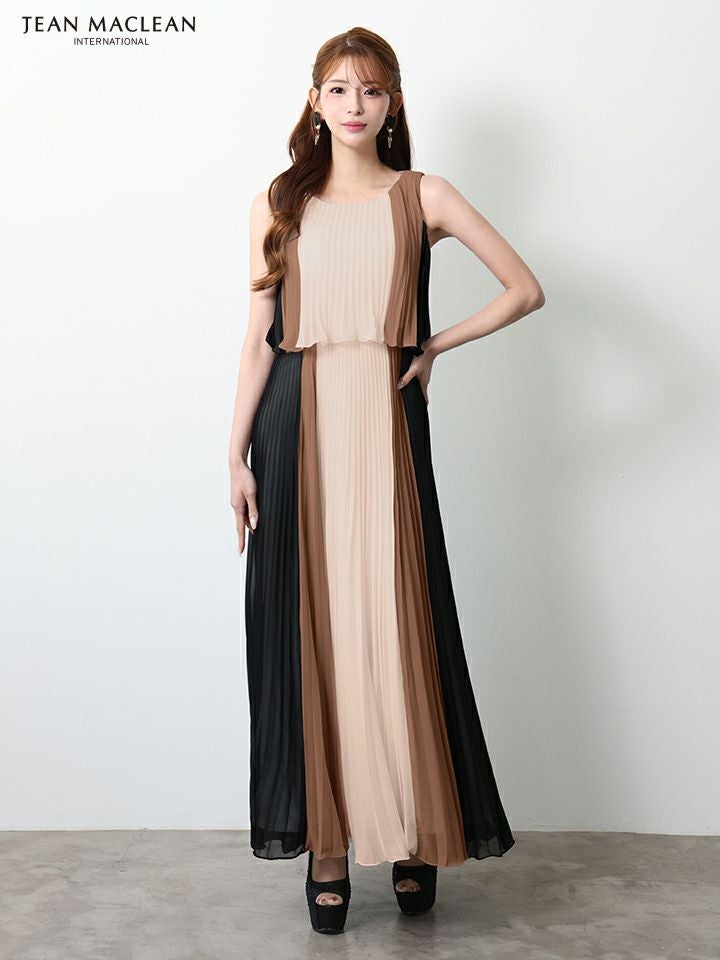 5. [JEANMACLEAN/ジャンマクレーン] 高級 ブランド ワンピース Aラインロングドレス ノースリーブ プリーツ シフォン 大人