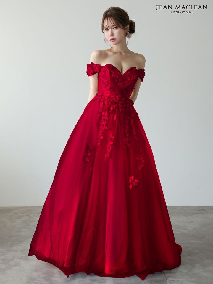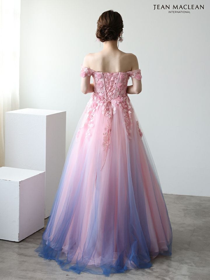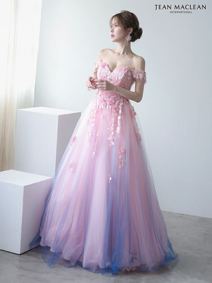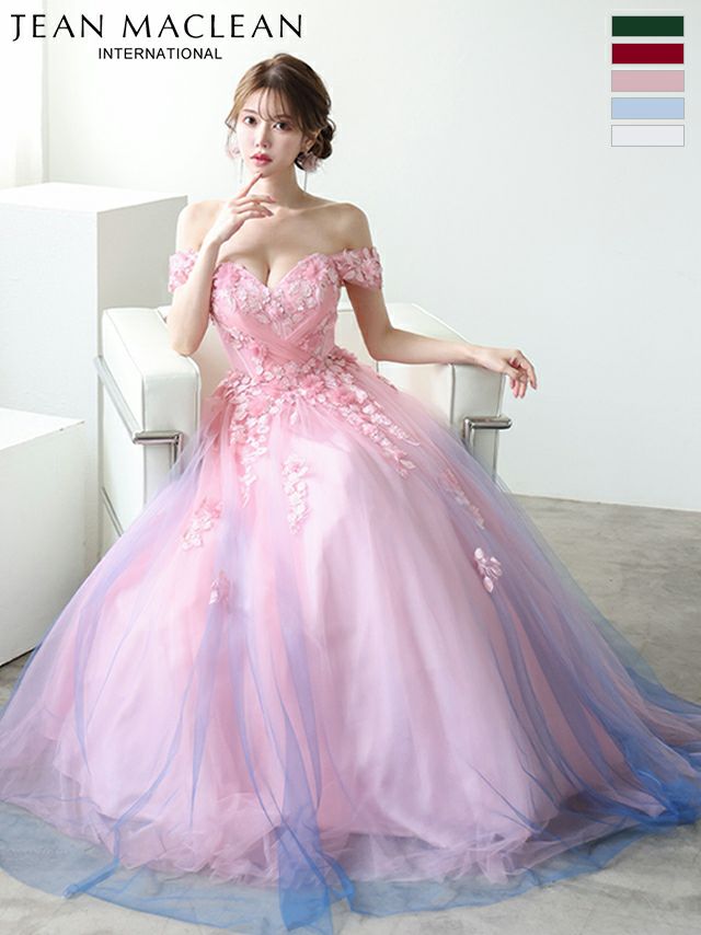 グラデーションのチュールが美しい♡ [JEANMACLEAN/ジャンマクレーン] 高級 ブランド バースデー Aラインロングドレス 谷間 オフショルダー ハートカット 立体フラワー グラデーション チュール