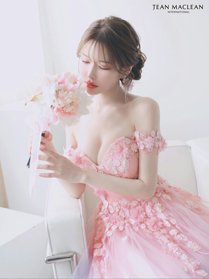 5. [JEANMACLEAN/ジャンマクレーン] 高級 ブランド バースデー Aラインロングドレス 谷間 オフショルダー ハートカット 立体フラワー グラデーション チュール