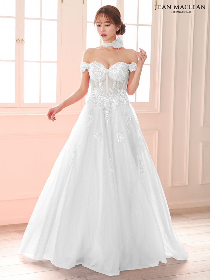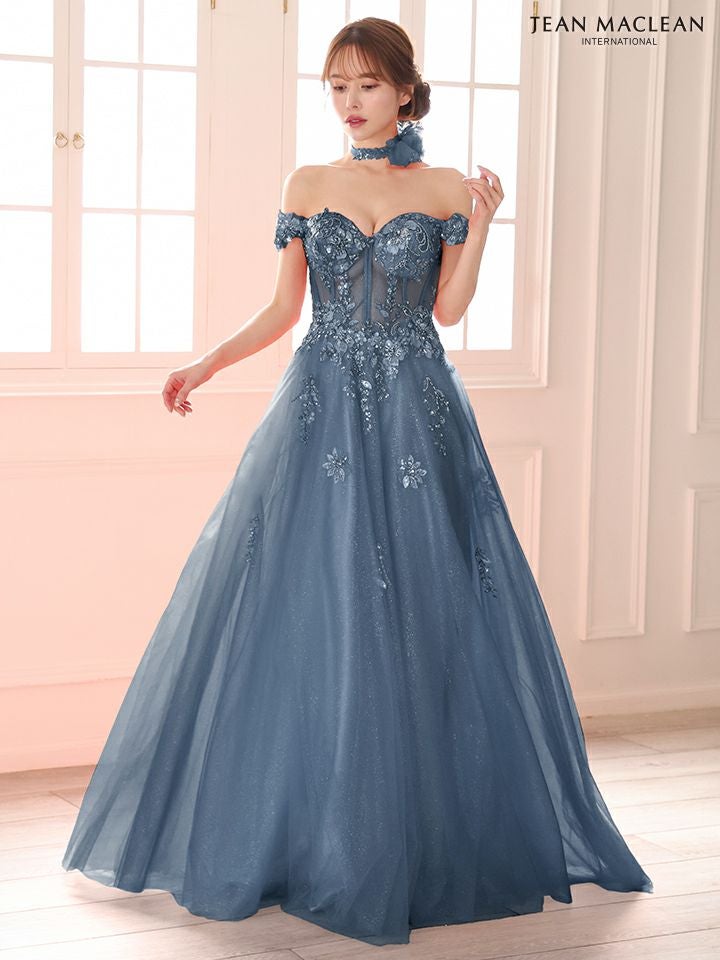 圧倒的な存在感を演出♡ [JEANMACLEAN/ジャンマクレーン] 高級 ブランド バースデー Aラインロングドレス 谷間 オフショルダー スパンコール刺繍 シアーコルセット風 チュール チョーカー付き