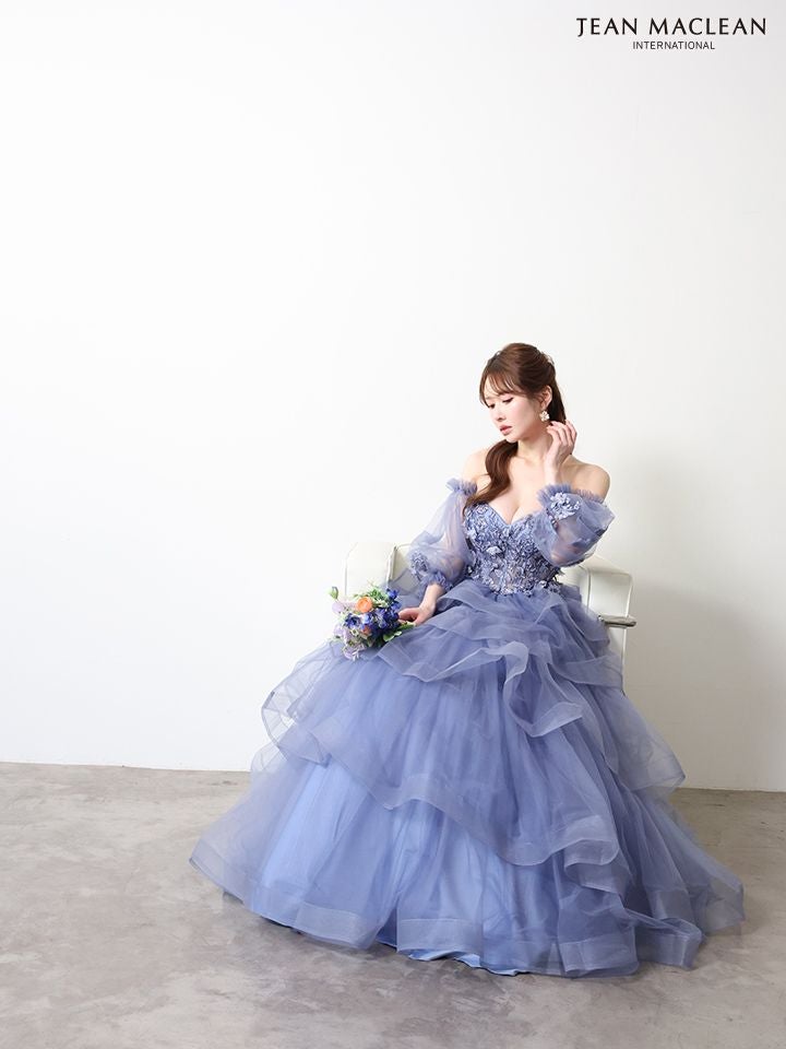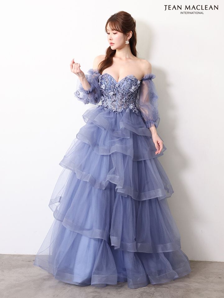 5. 予約商品【4月下旬入荷予定】[JEANMACLEAN/ジャンマクレーン] 高級 ブランド バースデー Aラインロングドレス 谷間 パフスリーブ付き ベア 2way 3Dフラワー スパンコール ティアード フリル