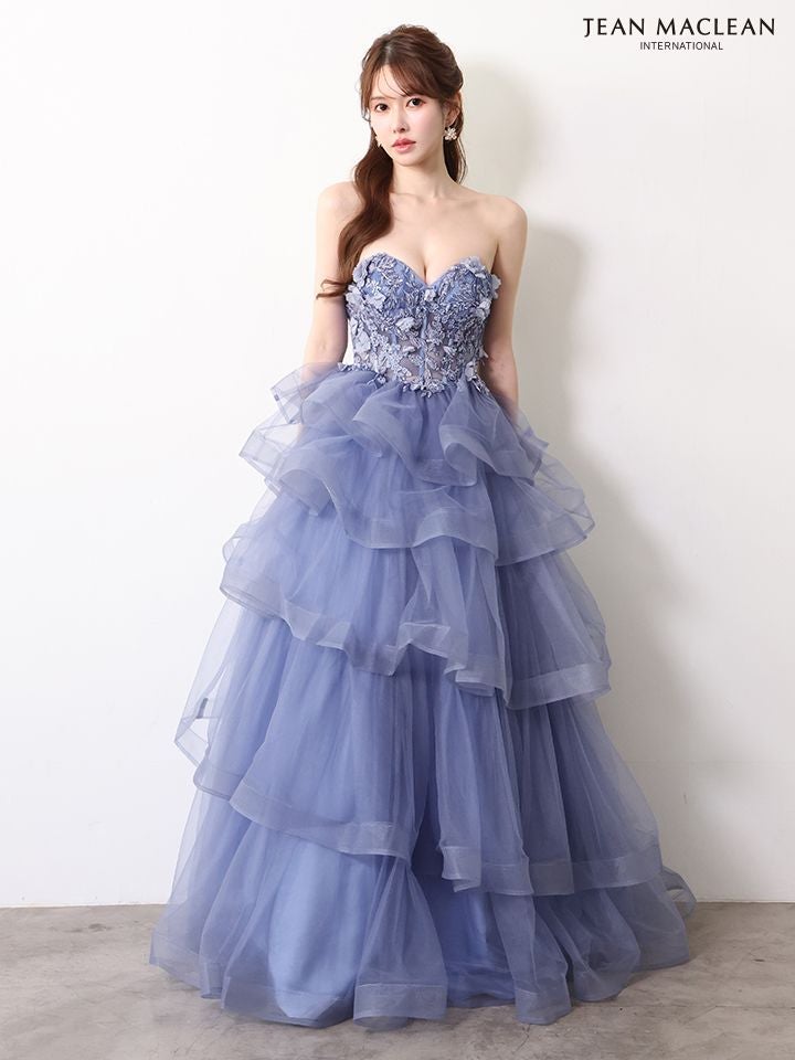 ティアードフリルで華やかに♡ 予約商品【4月下旬入荷予定】[JEANMACLEAN/ジャンマクレーン] 高級 ブランド バースデー Aラインロングドレス 谷間 パフスリーブ付き ベア 2way 3Dフラワー スパンコール ティアード フリル