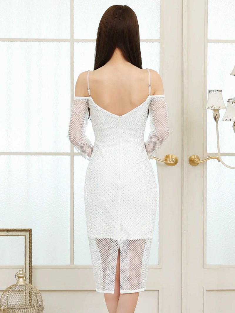 6. [Veautt/ヴュート] 高級 肩出し 二の腕カバー 長袖 袖あり ビジュー付きメッシュ バストシースルー バック 谷間魅せ タイト 膝丈ドレス