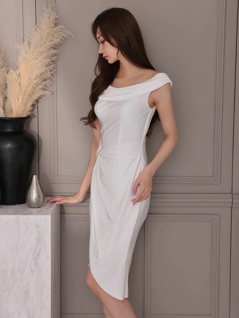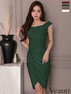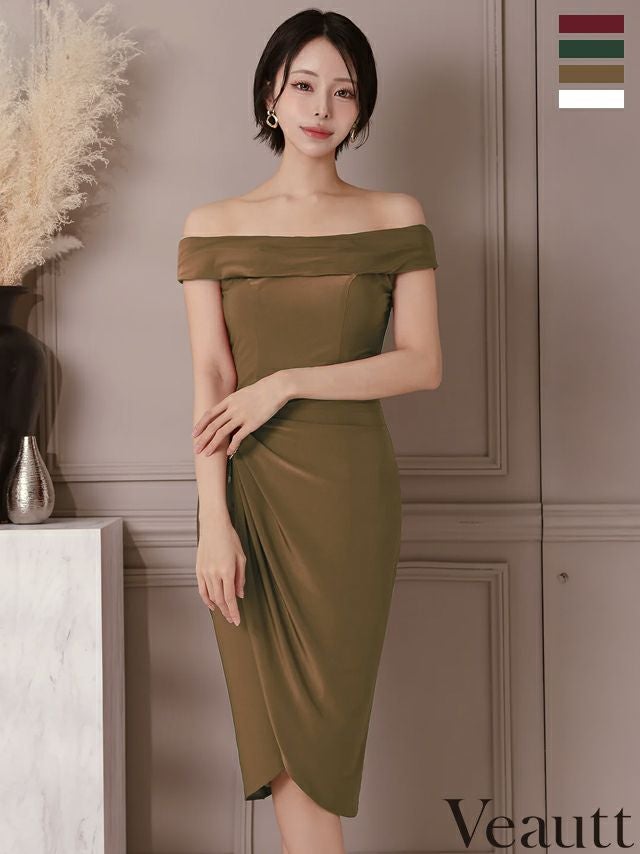 ラップ風スカートで美しい足元を演出♡ [Veautt/ヴュート] 高級 ブランド タイト膝丈ドレス オフショルダー ラップ風 タックデザイン