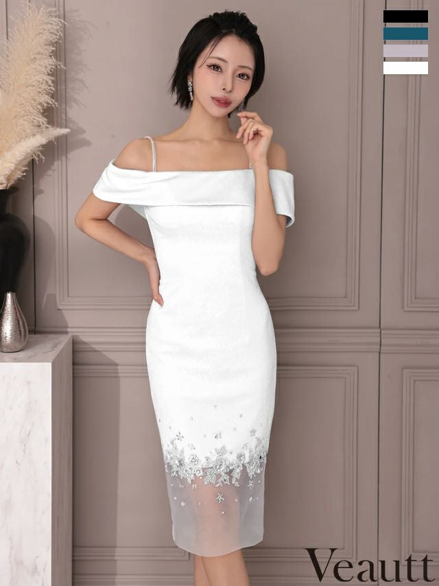 3. [Veautt/ヴュート] 高級 オフショルダー フラワー刺繍 シアー切替 タイト 膝丈ドレス