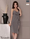 ショルダーチェーンがアクセント♡ [Veautt/ヴュート] 高級 キャミソール チェーン 谷間魅せ タックデザイン フリル スリット タイト膝丈ドレス