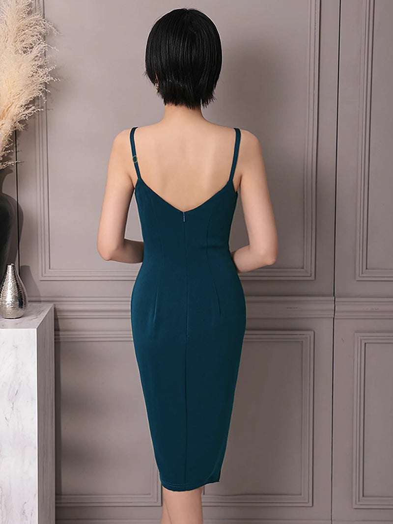 5. [Veautt/ヴュート] 高級 キャミソール チェーン 谷間魅せ タックデザイン フリル スリット タイト膝丈ドレス