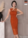 カットアウトが程よい抜け感を演出♡ [Veautt/ヴュート] 高級 ブランド タイト膝丈ドレス ノースリーブ スリット ビジューチェーン シアー