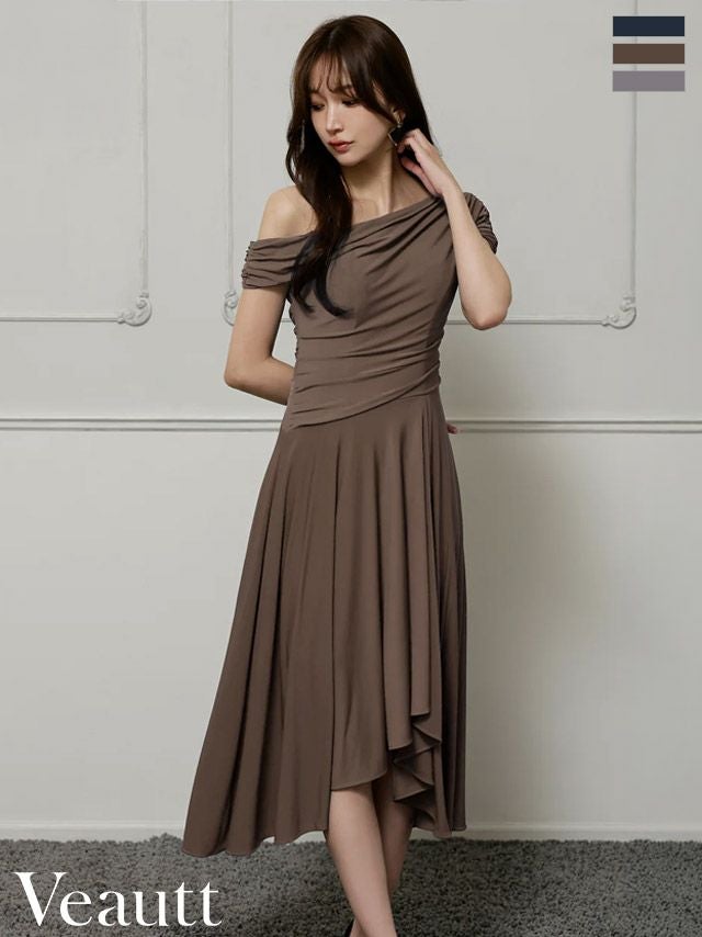 動いた時も美しさ引き立つ♡ [Veautt/ヴュート] 高級 ブランド Aライン 膝丈ドレス ワンショルダー アシンメトリー 大人 ドレープ