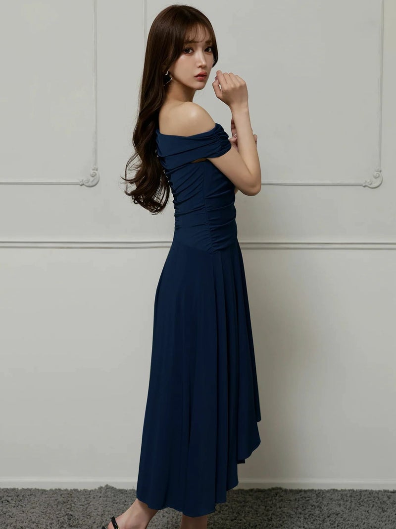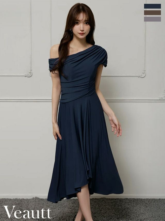 女性らしい抜け感を演出♡ [Veautt/ヴュート] 高級 ブランド Aライン 膝丈ドレス ワンショルダー アシンメトリー 大人 ドレープ