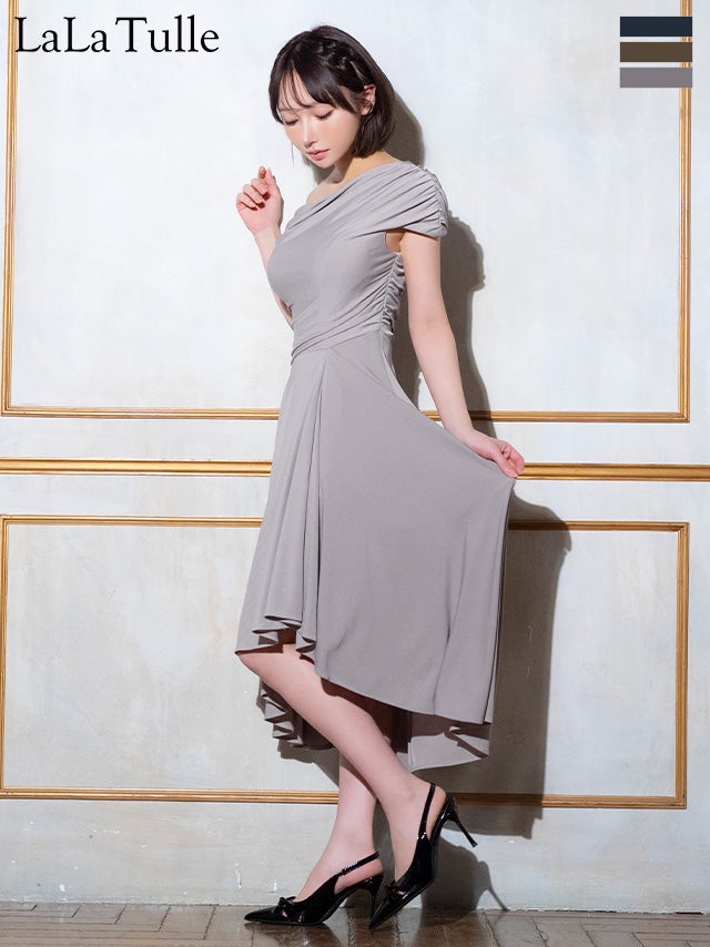 3. [Veautt/ヴュート] 高級 ブランド Aライン 膝丈ドレス ワンショルダー アシンメトリー 大人 ドレープ (せな着用)