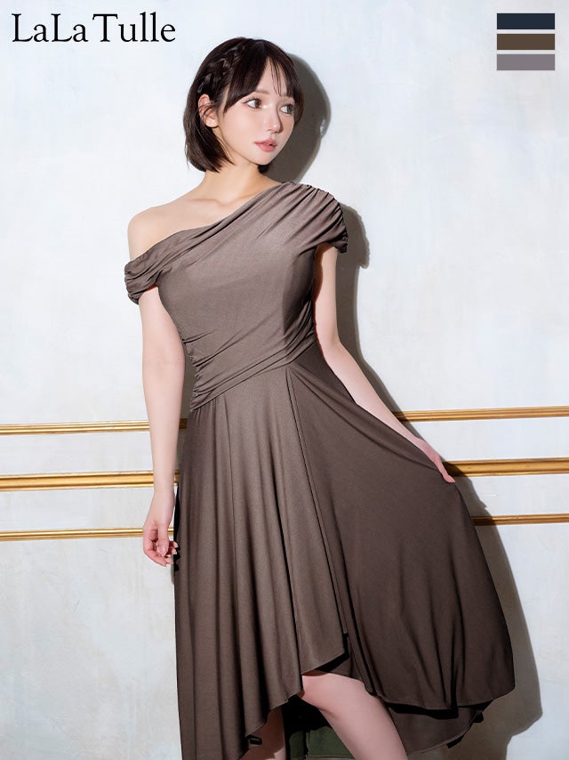 5. [Veautt/ヴュート] 高級 ブランド Aライン 膝丈ドレス ワンショルダー アシンメトリー 大人 ドレープ (せな着用)