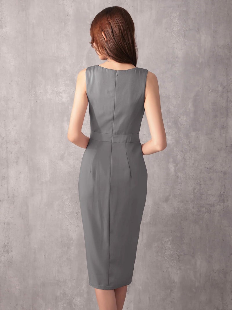 デコルテラインを美しく見せる♡ [Veautt/ヴュート] 高級 ブランド タイト膝丈ドレス ノースリーブ 谷間 カシュクール風 フリル スリット ワンカラー