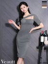 エレガントなオーラを纏う♡ [Veautt/ヴュート] 高級 ワンショルダー 半袖 バストカット ラメ 谷間魅せ ファスナースリット タイト 膝丈ドレス