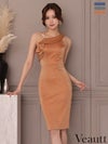 4. [Veautt/ヴュート] 高級 アシンメトリー ノースリーブ チェーン 胸元フリル ファスナースリット タイト膝丈ドレス