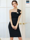 目を惹くリボンで華やかに♡ [Veautt/ヴュート] 高級 ビッグリボン ワンショルダー パールストラップ付き バックスリット タイト 膝丈ドレス