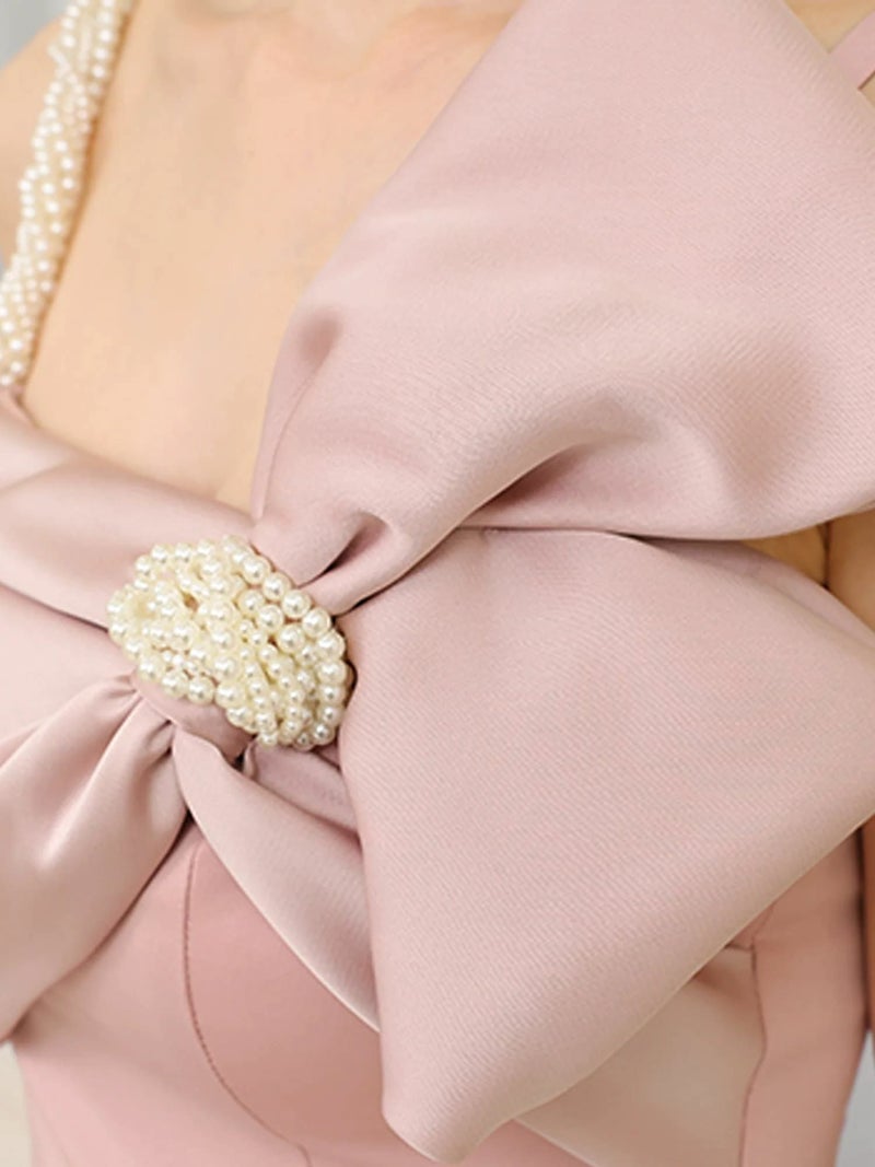 3. [Veautt/ヴュート] 高級 ビッグリボン ワンショルダー パールストラップ付き バックスリット タイト 膝丈ドレス