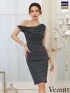 大人の色気を醸し出す☆ [Veautt/ヴュート] 高級 ワンショルダー リング ドレープ ファスナースリット ワンカラー タイト 膝丈ドレス