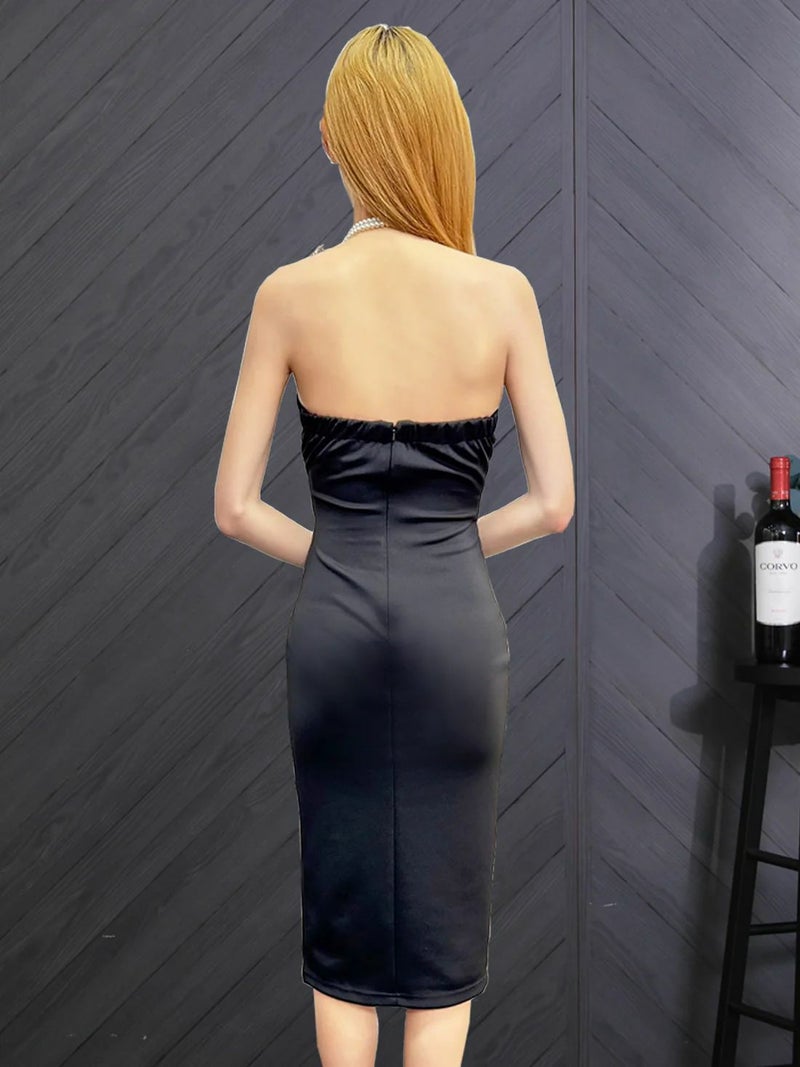 4. [Veautt/ヴュート] 高級 ホルターネック パール スカーフ付き スリット サテン タイト 膝丈ドレス