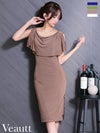エレガントな雰囲気を纏う♡ [Veautt/ヴュート] 高級 ノースリーブ ショルダーチェーン レイヤード風デザイン ドレープ ファスナースリット タイト 膝丈ドレス