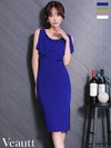 5. [Veautt/ヴュート] 高級 ノースリーブ ショルダーチェーン レイヤード風デザイン ドレープ ファスナースリット タイト 膝丈ドレス