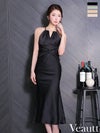 ウエストのタックデザインで細魅え☆ [Veautt/ヴュート] 高級 ホルターネック ギャザートップ ウエストタックデザイン ネックチェーン ビジュー タイト膝丈ドレス