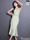 5. [Veautt/ヴュート] 高級 ホルターネック ギャザートップ ウエストタックデザイン ネックチェーン ビジュー タイト膝丈ドレス