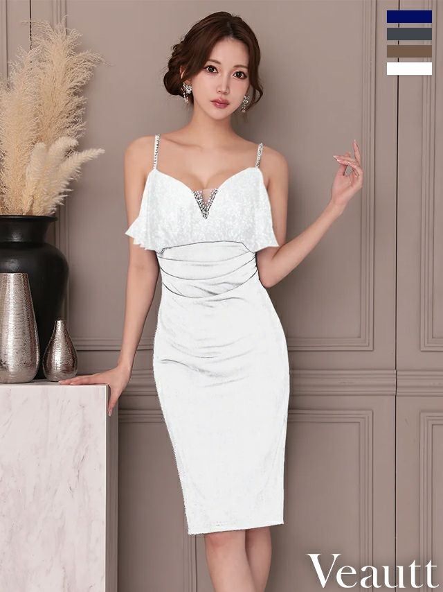 エレガントな雰囲気を纏う♡ [Veautt/ヴュート] 高級 ブランド タイト膝丈ドレス キャミソール 谷間 フリル ビジュー ウエストタック 大人 ワンカラー