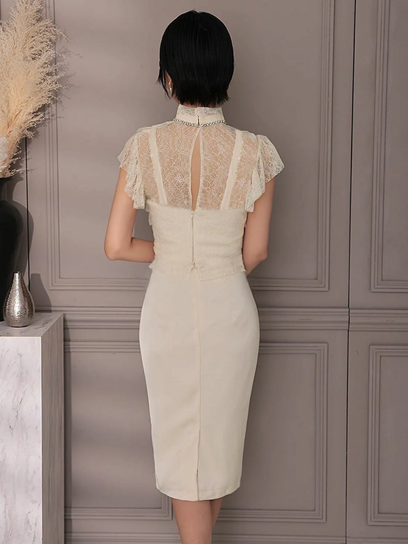 5. [Veautt/ヴュート] 高級 ノースリーブ レース フリル ハイネック ビジュー 胸元カバー タイト膝丈ドレス