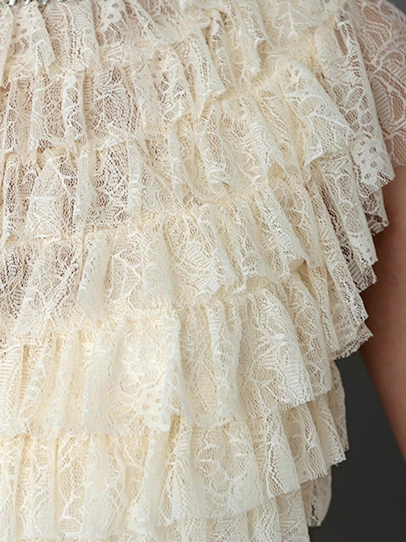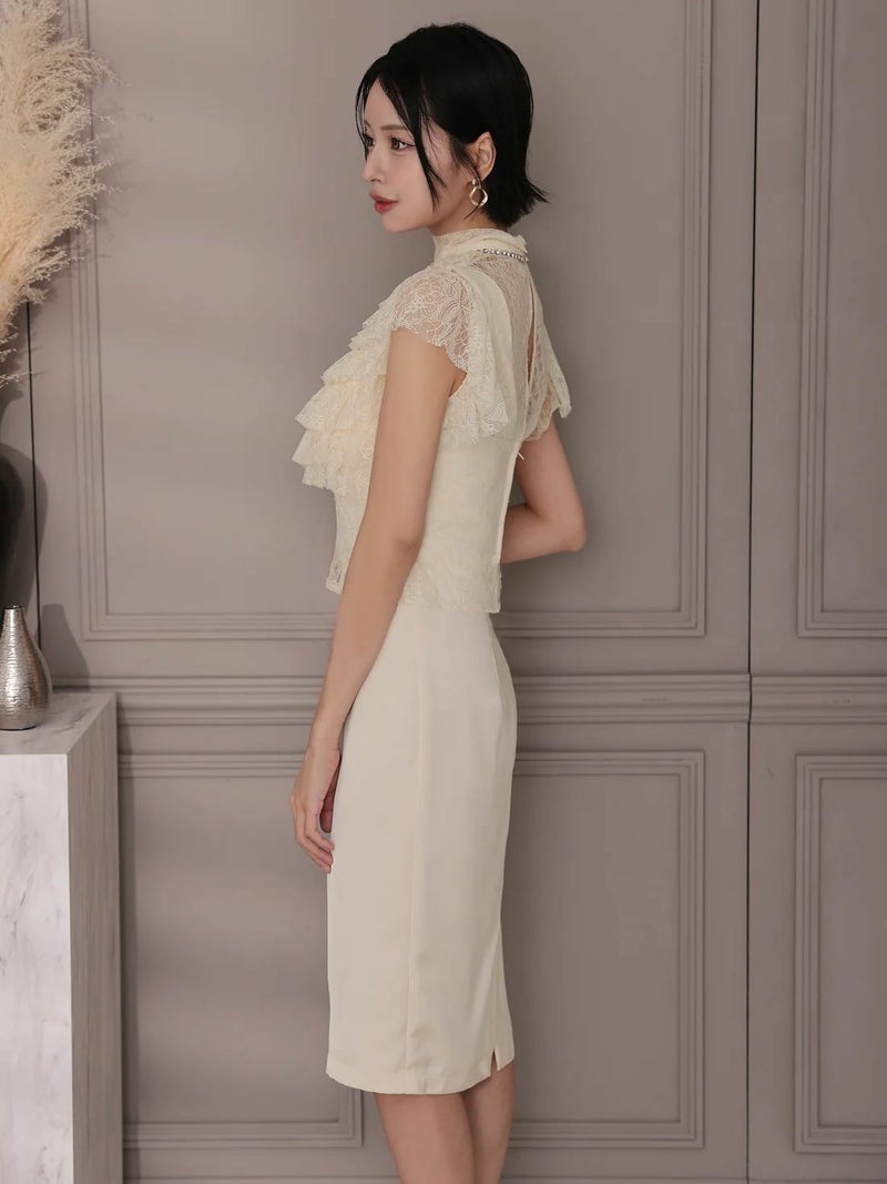 5. [Veautt/ヴュート] 高級 ノースリーブ レース フリル ハイネック ビジュー 胸元カバー タイト膝丈ドレス