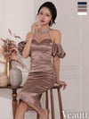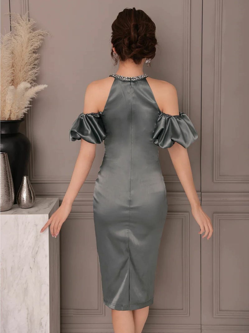 光沢感が上品に映える♡ [Veautt/ヴュート] 高級 ブランド タイト膝丈ドレス ホルターネック 2way パフスリーブ付き 大人 シアー ビジュー