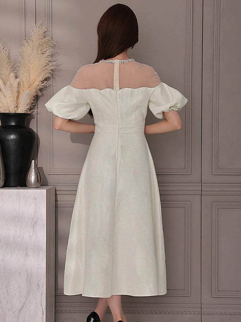 5. [Veautt/ヴュート] 高級 半袖 パフスリーブ シアー ビジュー ワンカラー ポケット付き Aラインロングドレス