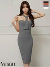 美しいシルエットを描く1着♡ [Veautt/ヴュート] 高級 ブランド タイト膝丈ドレス ホルターネック ジップスリット リング 大人 ワンカラー