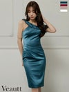 ビジューチェーンが煌めきをプラス♡ [Veautt/ヴュート] 高級 ブランド タイト膝丈ドレス ワンショルダー ビジューチェーン ウエストタック サテン 大人 ワンカラー