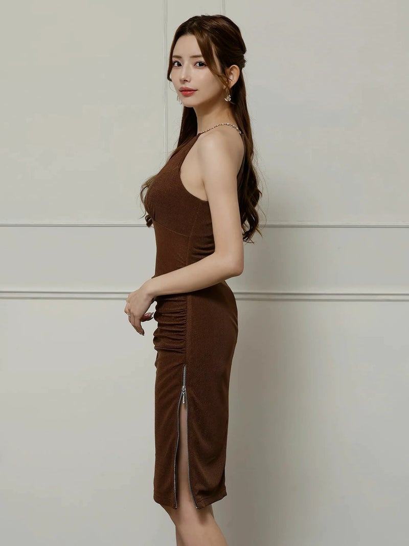 3. [Veautt/ヴュート] 高級 ブランド タイト膝丈ドレス ホルターネック スリット デコルテシアー ビジューチェーン